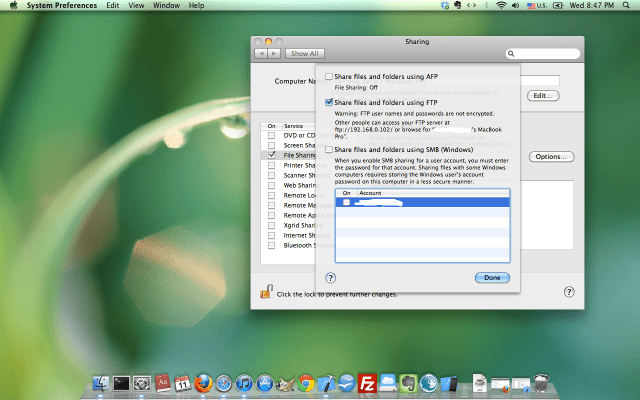 To allow file transfer between your Mac and iPad/iPhone app like Browser 2Go or Download 2i, you first enable “File Sharing” on your Mac, insider your System Preference, click “Sharing”, Click “File Sharing”, Click on “Options”, Select “Share files and folders using FTP”, as shown in the following screenshot: