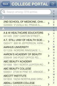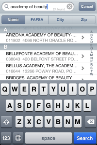 – Instant search results display. Search name, Federal School Code (FAFSA), Zip, and city.