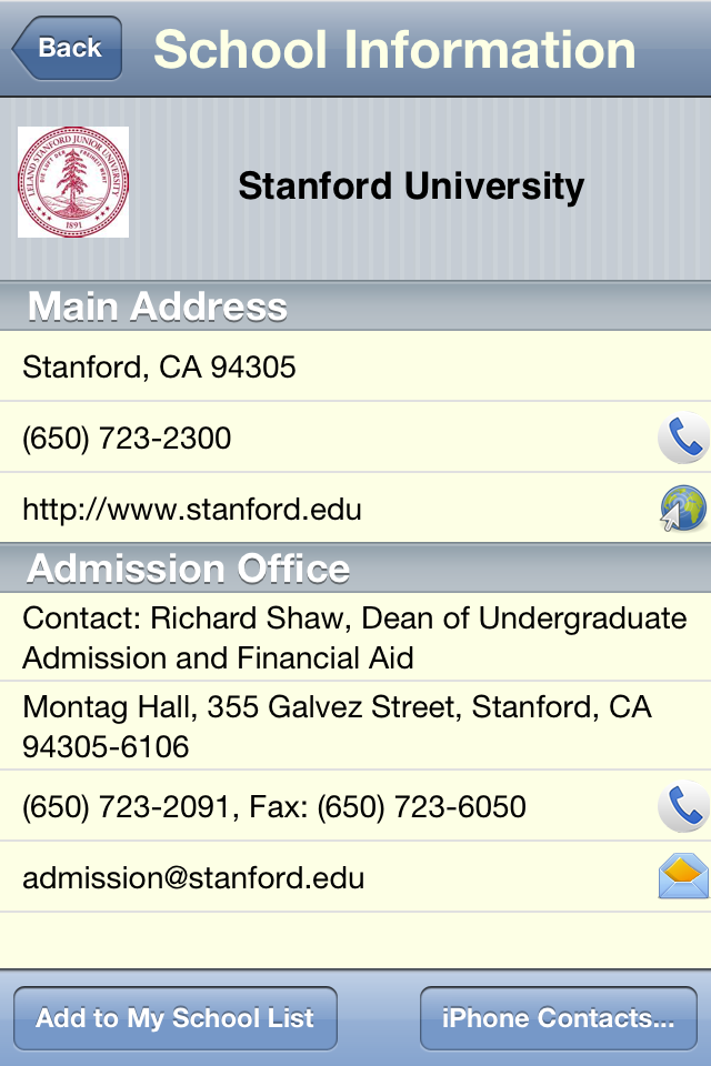 4. Export school information to your Contacts (on the device or iCloud). All exported contacts will be put in the “College Contacts” group. With the school contact, standard Contacts features are available: