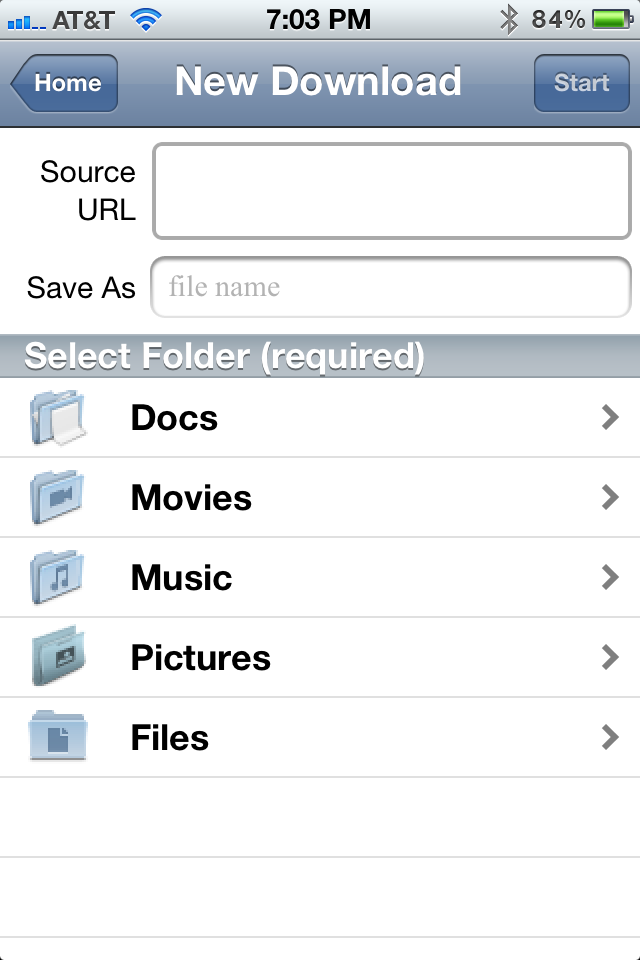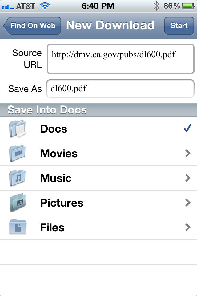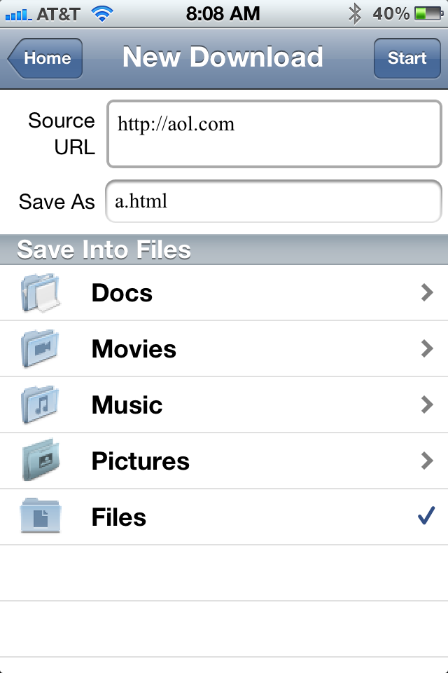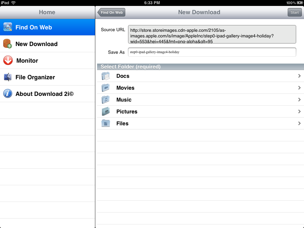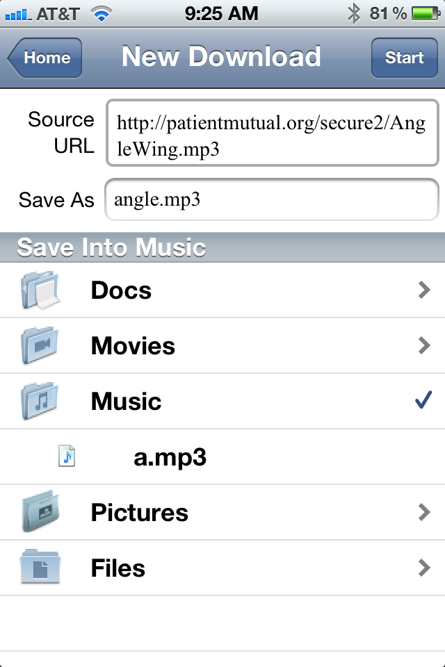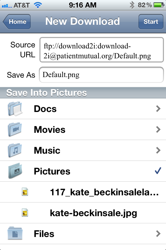 So the process is that you tap “New Download”, enter source FTP URL(please include user name and password if it is account protected, as in the example), the file name you want to save as, then select a folder you like to save into, tap “Start” button on upper right corner.所以这个过程是你点击“下载”,输入源的FTP URL(请包括用户名和密码,如果是帐户保护的例子,),你要保存为文件名,然后选择你喜欢的文件夹保存到,点击右上角的“开始”按钮。 Then the download and saving process will begin.然后下载并保存过程将开始。