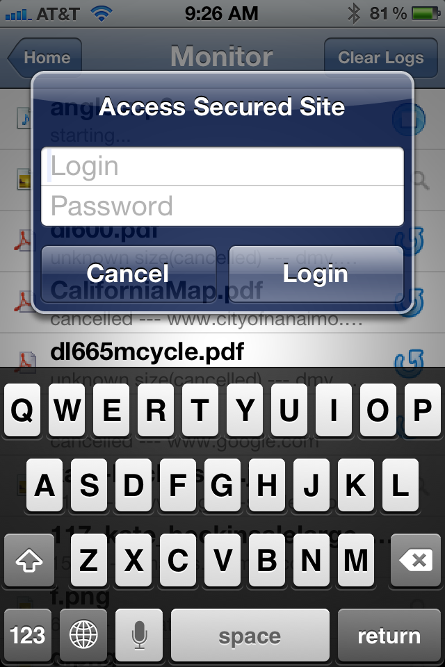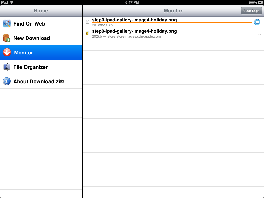 The Download Monitor allows you to stop, reload and watch downloading progress.下载监视器允许你停止,重新加载,并观看下载进度。 There are no theoretical limitation on how many downloads you can have simultaneously.有没有多少下载,你可以同时有理论限制。 You can delete single download log entry by “swipe” the entry, then touch “delete” button.您可以“刷卡”的条目删除单下载日志条目,然后按“删除”按钮。 There is a “clear logs” button for you to clear all logs. Please note that the downloaded files can only be deleted in File Organizer.有“清除日志”按钮,为您清除所有日志,请注意,下载的文件只能在文件管理器中删除。 Deleting logs does not delete the downloaded files. 删除日志不删除下载的文件。