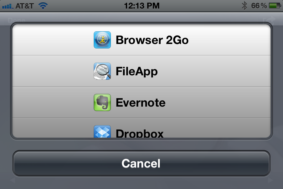 If you tap the right upper corner button, you will see the options to open this file in other Apps on your device:如果您点击右上角的按钮,你会看到的选项来打开这个文件在您的设备上的其他应用程序: