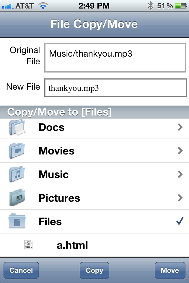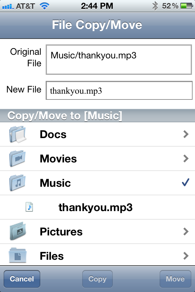 then tap ‘Copy’ or ‘Move’ button, the file will be copied or renamed as a different file, and possibly into a different folder.然后点击“复制”或“移动”按钮,该文件将被复制或更名为不同的文件,并可能成为一个不同的文件夹。